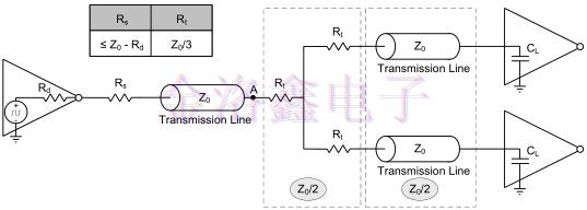 所謂的星形拓?fù)淦渲惺且环N結(jié)構(gòu),相當(dāng)于一個轉(zhuǎn)接站,向各個節(jié)點(diǎn)傳送信息,因為有五個節(jié)點(diǎn)整體看起來像一顆五角星一樣,所以被叫做星形拓?fù)?/span>.在某些情況下,當(dāng)石英晶體振蕩器的驅(qū)動器強(qiáng)度不足以驅(qū)動兩條傳輸線(輸出阻抗太高)時,可以使用啟動拓?fù)?/span>(圖11).Rt電阻網(wǎng)絡(luò)用作中間終端.Rt的值通常選擇為等于傳輸線阻抗的三分之一(Z0/3),因此當(dāng)從任何節(jié)點(diǎn)觀察時,三個Rt電阻器的星形連接具有Z0/2的阻抗.具有Z0阻抗的兩條傳輸線的并聯(lián)連接具有Z0/2阻抗,因此當(dāng)從點(diǎn)A(圖11)朝向負(fù)載看時,阻抗是Z0,其等于從源看的阻抗.A點(diǎn)的阻抗匹配,因此不會發(fā)生反射.