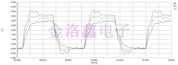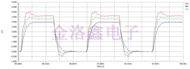 圖12:SiT8208貼片晶振使用星形拓?fù)潋?qū)動兩條傳輸線的角落(溫度,電源電壓和工藝)的Altium Designer仿真波形(在負(fù)載側(cè))(圖11).走線阻抗-60Ω,走線段長度-2in.,標(biāo)稱電源電壓-3.3V,Rs=10Ω,Rt=10Ω,CL=5pF.圖13和圖14顯示了模擬結(jié)果,說明了信號波形如何分別隨Rt和Rs變化.