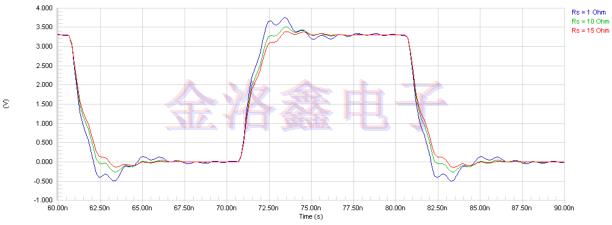 圖14:使用星形拓?fù)潋?qū)動兩條傳輸線的SiT8208的Rs值范圍的Altium Designer仿真波形(在負(fù)載側(cè))(圖11).走線阻抗-60Ω,走線段長度-2英寸,電源電壓-3.3V,Rt=10Ω,CL=5pF.